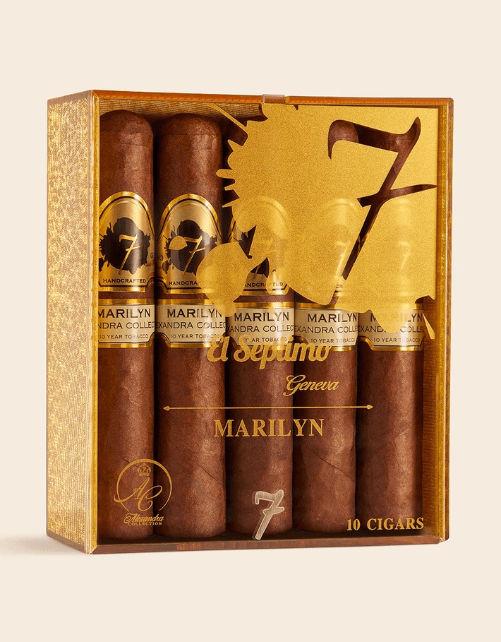 • The El Septimo Alexandra Marilyn is a medium strength cigar has a slightly bigger ring gauge, making it the perfect slow-burn with an even draw. With a delicious blend of chocolate and nutmeg instantly filling the mouth, a light sweetness holds a middle position. The second and final thirds of the smoke bring a strong flavor of dark-roasted coffee and a dull, chocolatey sweetness. All-in-all, customers describe this cigar as having the ultimate buttery texture, paired with pleasing, but contrasting musky spices.